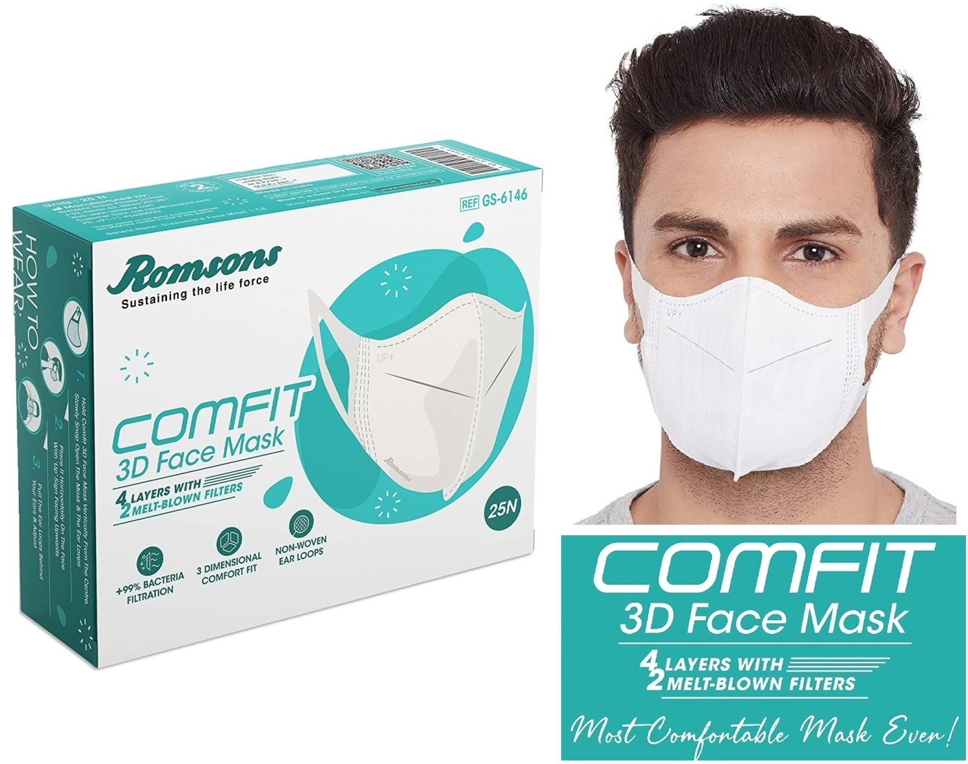 India's Most Comfortable, Disposable 3D Face Mask, Comfit features a non-woven ear loop design. Crafted from Latex-Free, Hypoallergenic fabric, Comfit comes with a 4-Layer Protection including 2 Layers of Melt-Blown Filter. It provides effective protection to the wearer from bacteria shed in droplets and aerosols, keeping the user comfortable for long hours. How To Wear: Hold Comfi Fit 3-D Face Mask Vertically From The Centre. Slowly Snap Open The Mask & The Ear Loops. Place It Horizontally On The Face With ‘Up’ Sign Facing Upwards. Pull The Ear Loops Behind Your Ears & Adjust .